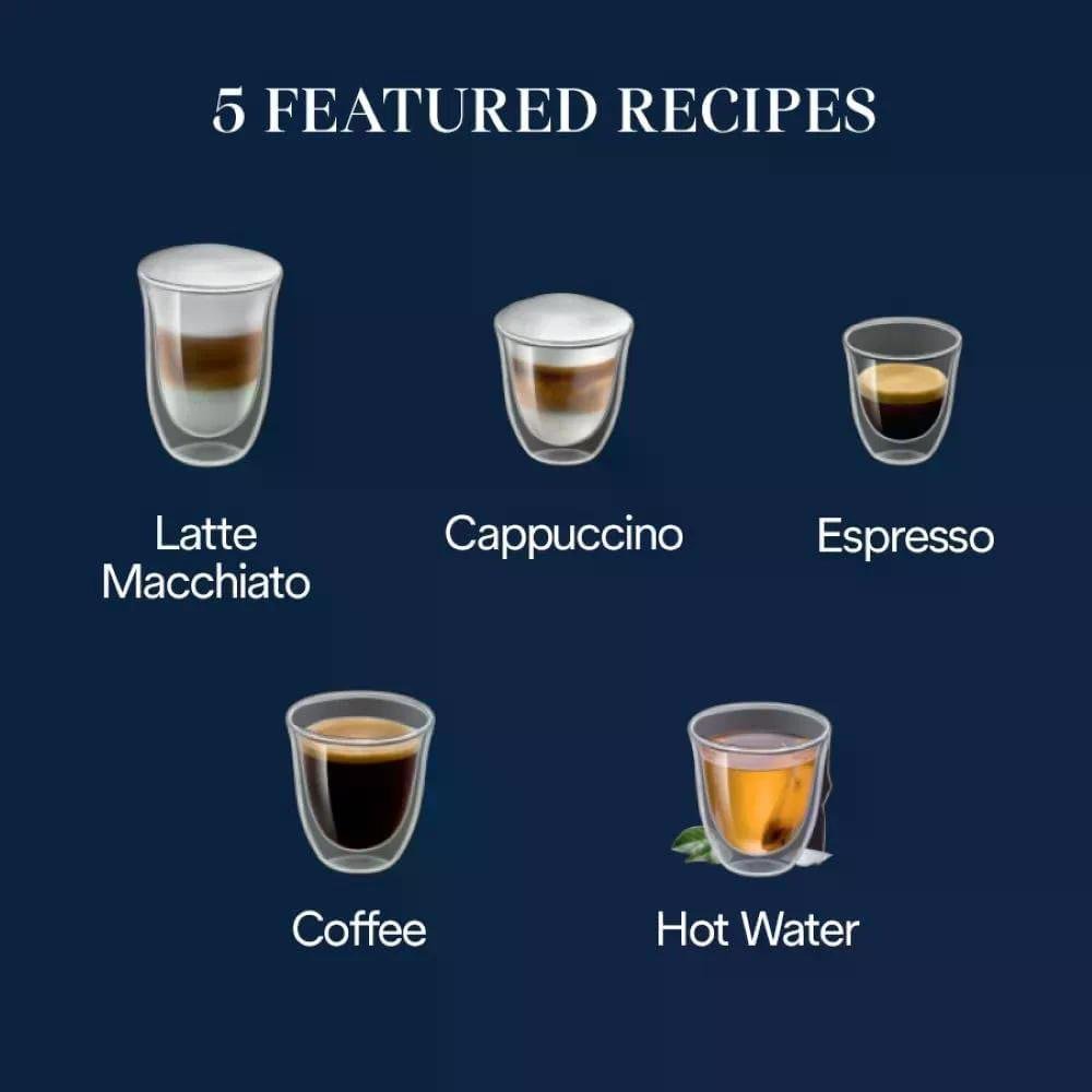 • Five One-Touch Recipes with Color Icons; Espresso, Cappuccino, Latte Macchiato, Coffee, and Hot Water.